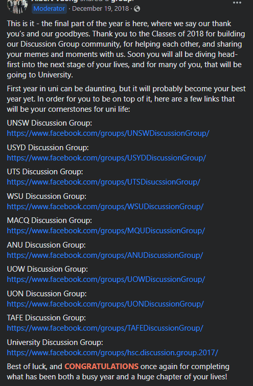 Throughout this article, I’ll be using a group that my good friends and I created as a case-study. The topic we focused on was the Higher School Certificate (Australia’s largest high school exam that dictates tertiary education admission). We called our group, the “HSC Discussion Group”, where students could rant, learn and socialise in a central online community. Before this group was formed, online student communities were fragmented across various forums and local groups. Using Facebook Groups, we saw an opportunity for all student discussion to occur in this one-stop shop.